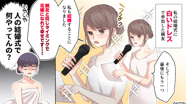 挙式当日、親友はなぜか真っ白なパーティードレスで参列していました。一体どういうつもりなのか……。モヤモヤしながら式は進んでいき、親友のスピーチが始まりました。