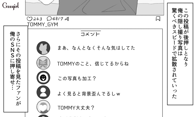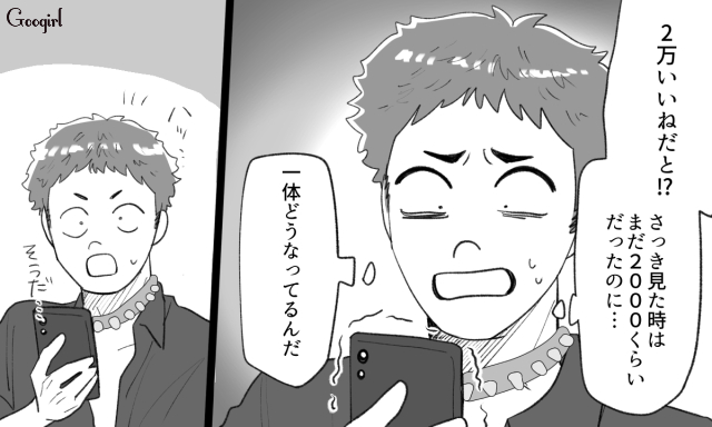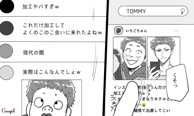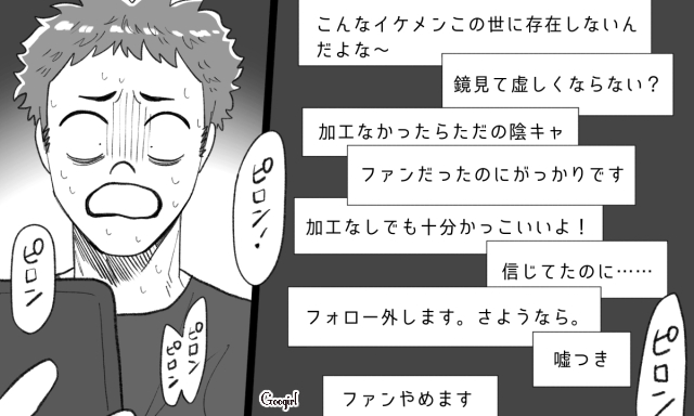 ▽ 加工ナシの真実の姿が世間に拡散され、SNSがプチ炎上状態になってしまった斗真。真実の姿を突きつけられ、徐々に追い詰められていきます。