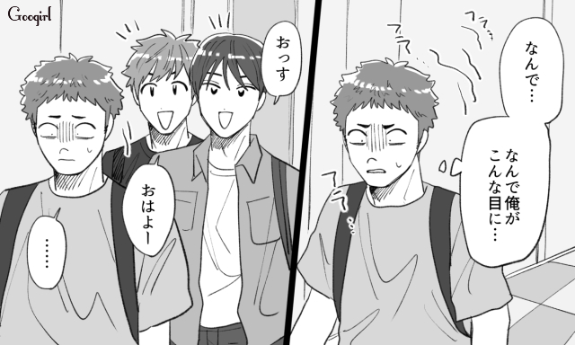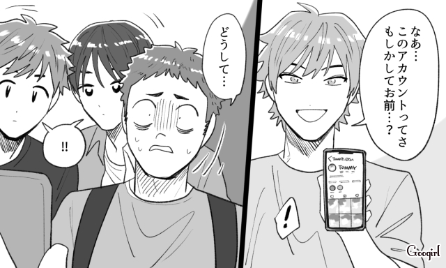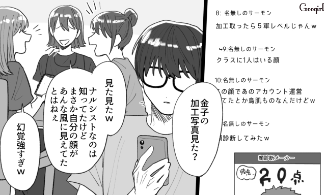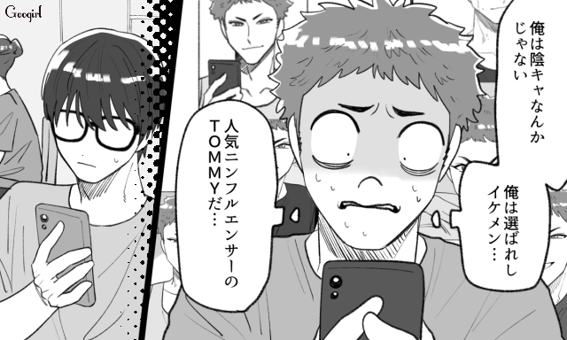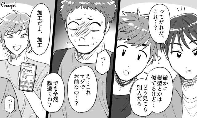 ▽ ネット内だけでなく、大学の友人たちの間にまで加工アカウントのことが知れ渡ってしまった斗真。加工後の写真を見て必死に自我を保とうとしますが、それもそろそろ限界のようです。