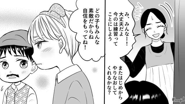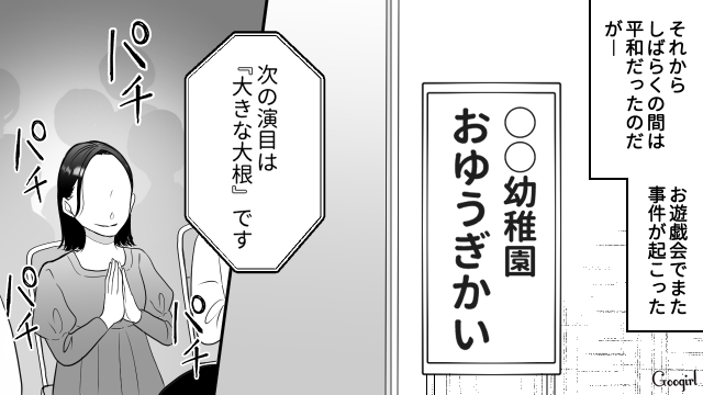 麗子とのトラブルの後しばらくして。幼稚園の一大イベント、お遊戯会の日がやってきました。子どもたちは張り切って舞台に立ち、保護者席も温かな拍手に包まれているのですが、またしても麗子がトラブルを起こします。