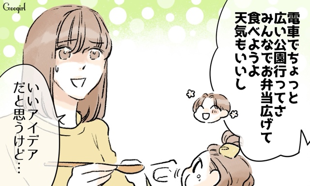 1歳の娘ルカをワンオペ育児中のミツキ。夫サトルは、ブラック企業からの転職が決まり、育休復帰までにしっかり育児を分担していきたいなと期待を膨らませていたものの、これから夫を教育していかないといけないことに気づくミツキ。今まで育児に関われてなかった分知らないことが多いサトルですが、協力的な姿勢にミツキは前向きに頑張ろうと思います。そんな休日の朝、サトルはいきなりピクニックに行こうと言い出しました。