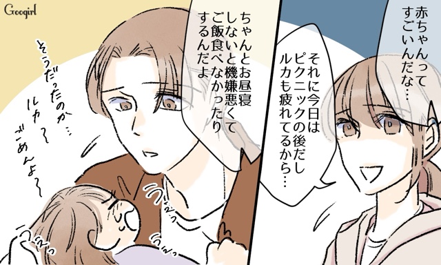 1歳の娘ルカをワンオペ育児中のミツキの夫サトルは、ブラック企業からの転職が決まり、育休復帰までにしっかり育児を分担していきたいなと期待を膨らませていましたが、これから夫を教育していかないといけないことに気づきました。ピクニックを終え、買い物にも行き、疲れて帰ってきたミツキ。お昼寝の時間ということもあり、ルカはぐっすり寝ています。あと1時間は寝るから、休憩しようと話すミツキをよそに、いきなりサトルがルカを起こしてきて……!?