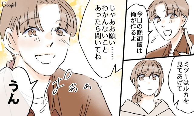 ▽ スマホをずっと見て子どもを蔑ろにしているわけでもないのに、話を聞かずに批判してくるサトルにミツキは言い返します。晩御飯づくりをサトルに任せますが、彼は「肉がすべて冷凍されている」と駆け込んできました。