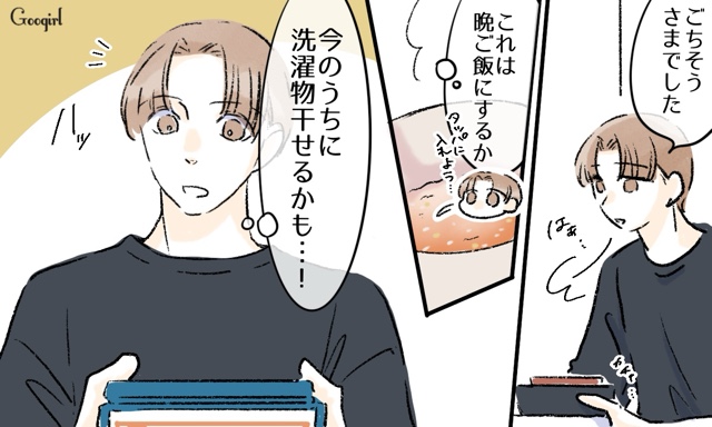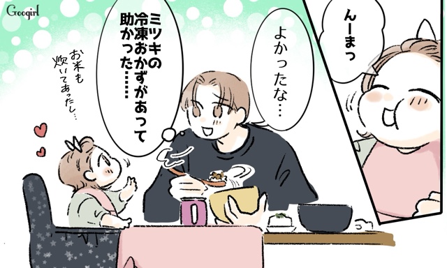 ▽ ミツキが作っておいてくれた冷凍の作り置きおかずと納豆を食べさせ、なんとかルカのご機嫌を取ることができました。食べてくれているうちに、ササっと洗濯物を干そうとするサトルですが、リビングに戻るとそこには納豆で楽しそうに遊ぶルカがいました。