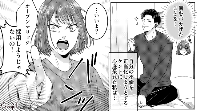 ▽ 都合よく「オープンマリッジ」という言葉を使っているだけな気がしますよね……。本来ならば、ミユの同意を得てからオープンに他の異性との関係を持たないと、隠している時点で単なる不倫です!