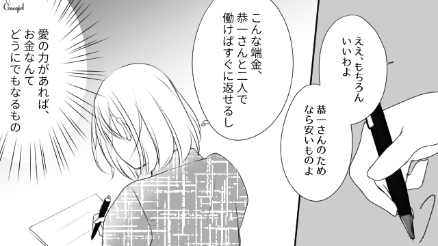 提示された慰謝料と公正証書。真梨香はその内容に一瞬眉をひそめるものの、「お金なんて愛の力でどうにでもなる」と楽観視し、勝利の証しとして大人しくサインをすることに。本当に「勝利」したのは、一体どちらなのでしょうか……?