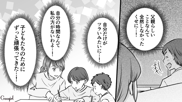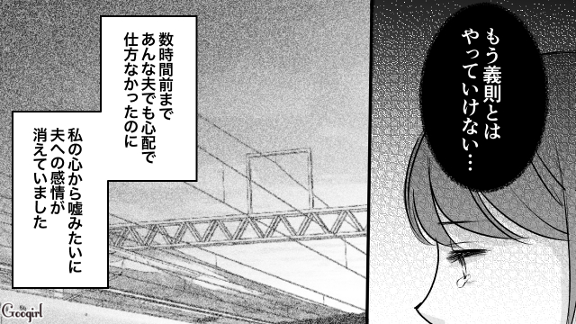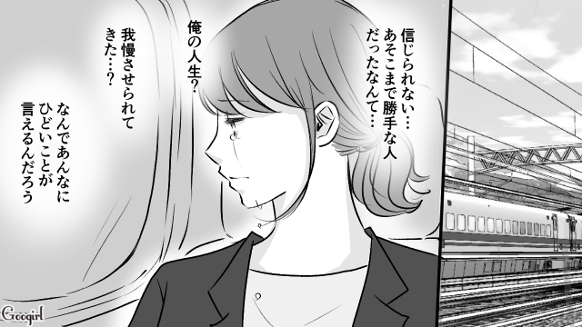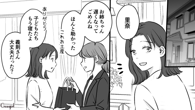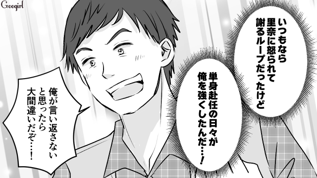 ▽ 里奈に言い返し、「単身赴任中は自由にしていい」と都合よく解釈した義則は、心配して駆けつけてきた里奈を追い返し、楽しく酒盛りを始めます。新幹線で家に戻る道中、義則との離婚を決意した里奈は、子どもたちを預かってくれていた姉に離婚を宣言するのでした。