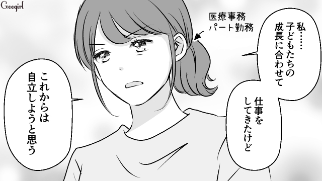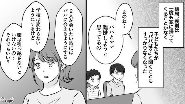 ▽ 離婚を決意した里奈は、姉から小さな仕事を回してもらい少しずつスキルアップ! 義則の単身赴任が終わる前に、充分な収入を得られるようになりました。離婚をすると緊張しながら子どもたちに伝えると、あっさりすぎる返事が返ってきました。