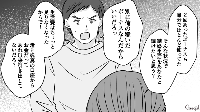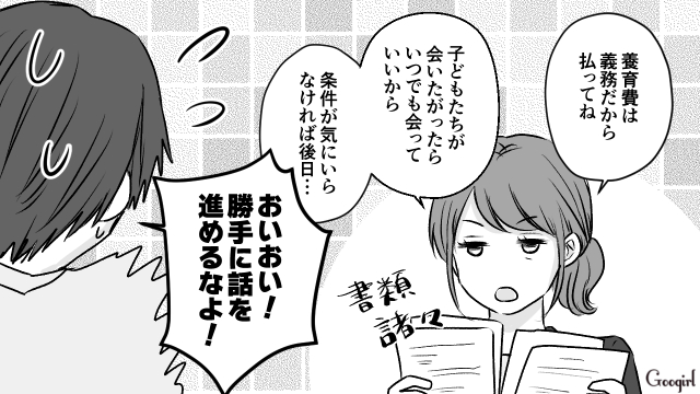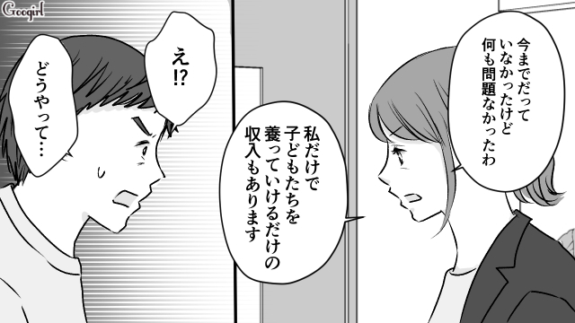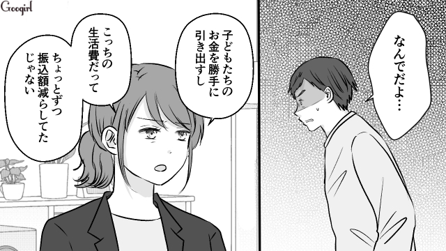 単身赴任を始めて3か月。義則は一度も帰省せず、休日は趣味三昧! 義則の1年の単身赴任が終わる前に、充分な収入を得られるようになった里奈は、子どもたちに義則と離婚することを伝えます。1年ぶりだぞと笑う義則に、まるで興味を示さない颯真と渚。渚からの連絡を受け、急いで帰ってきた里奈に、義則は離婚届を叩きつけられてしまいました。