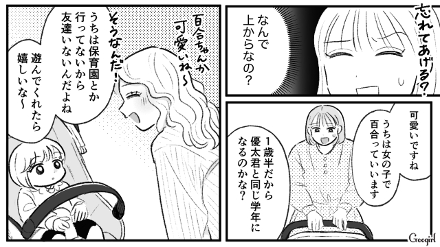 ▽ 同じ会社だとわかって喜ぶ京香とは対照的に、工事部の大地を思いきり見下す壮太。京香も問題ありそうなママですが、壮太はさらに問題ありありのパパみたいですね。自分がゆっくりしたいから夕方まで帰って来るなとか、こんな事言う旦那はイヤです!