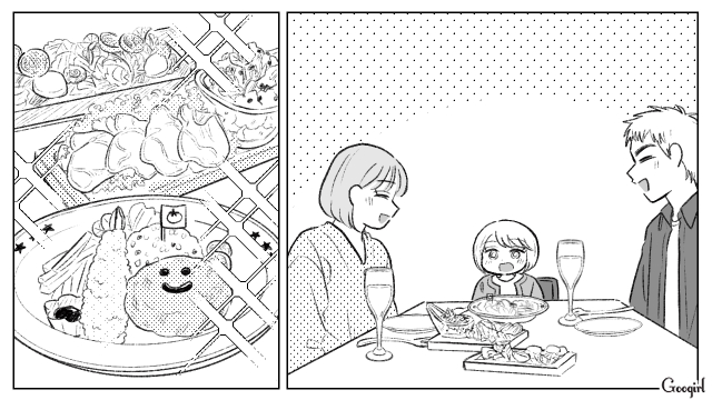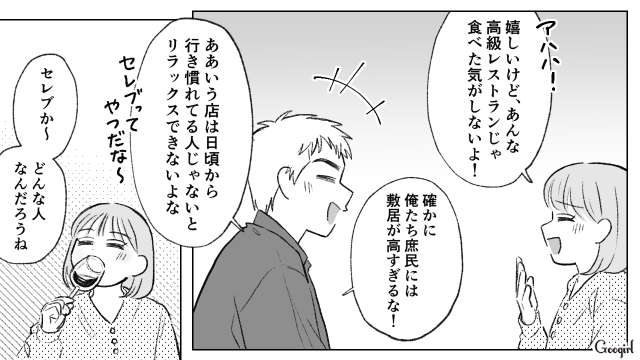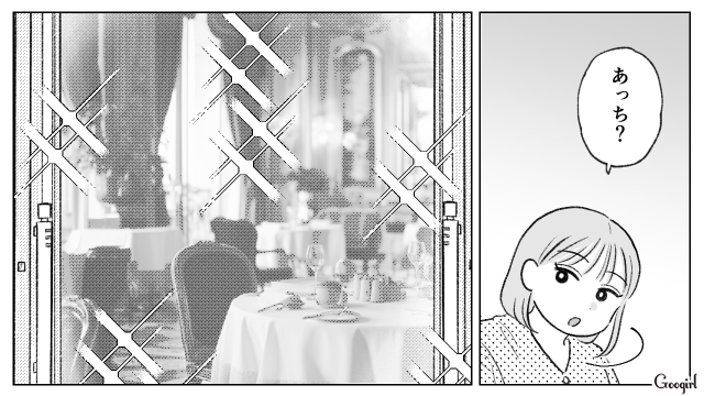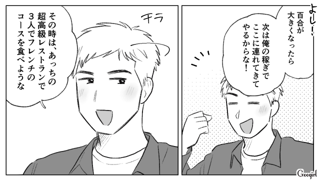 ▽ 百合が生まれて初めて、本格的なレストランでの食事を満喫して大満足の大地と愛美。いつかまたここへ来ようねと約束しつつ、窓の向こうに見える超高級フレンチレストランを自分達とは縁のない世界だと眺めますが……ラスボス登場です。