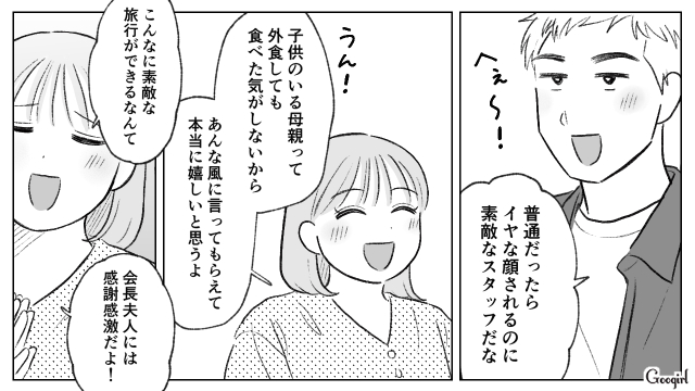 【スカッと漫画】「ベビーカーのお通りよ!」子連れ様全開の困ったママと一緒に社員旅行なんて、最悪?【第4話】 -
