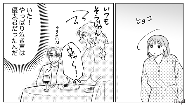 ▽ 無事に食事をすませて帰ってくれたら……との願いも虚しく、揉め始めた京香と壮太。優太の泣き声だけなら仕方ないかと思いますが、いい大人が2人して高級レストランでケンカなんて、本当に勘弁してほしいですね。