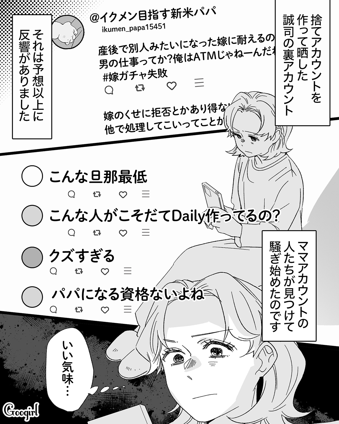 誠司の不倫を知った真帆は、誠司のひどい裏アカウントを晒しました。すると事態は大変なことになって……。