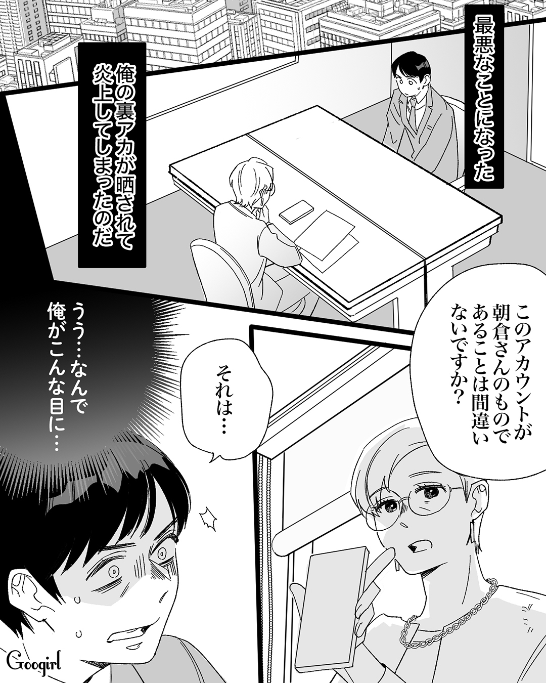 ▽ 晒した誠司のアカウントが、思った以上に広まって炎上しました。誠司は会社で詰められ、墓穴を掘りましたね。会社での立場も危なそうです……。