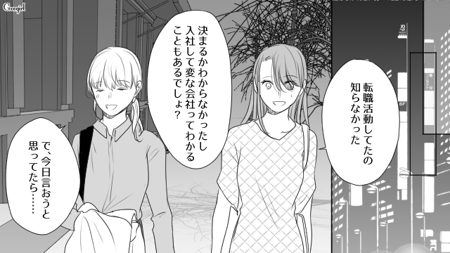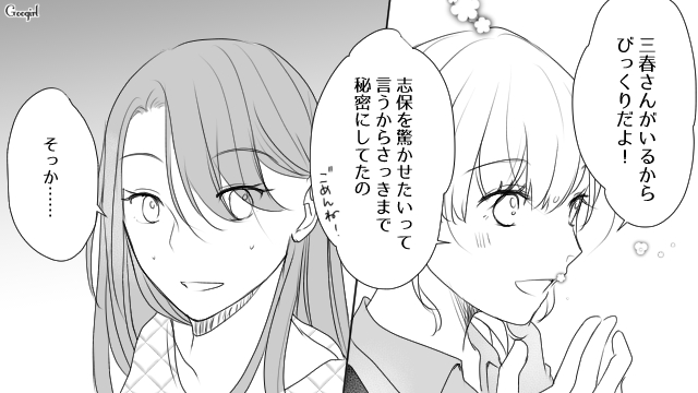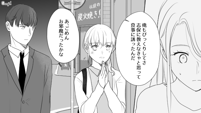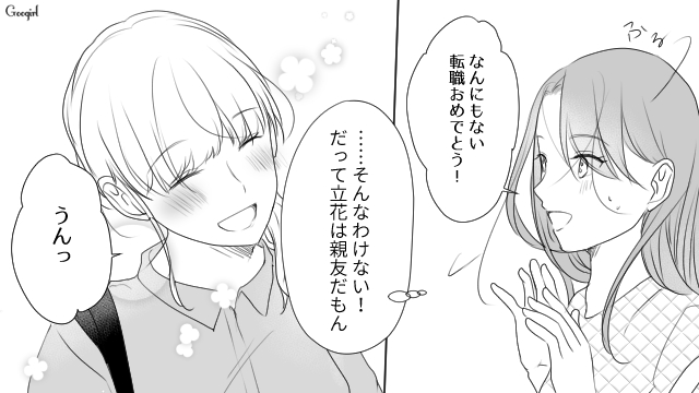 ▽ 三春とのデートに自然な顔で現れた立花に、志保は戸惑いを覚えます。転職の相談すらなかったことに違和感を抱き、「もしかして立花は三春のことが好きなのかも」と疑念がよぎる志保。しかし、自分を気遣い優しく接してくれる立花の姿に、親友だから大丈夫だと不安を打ち消すのでした。