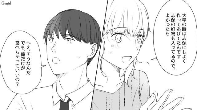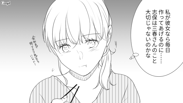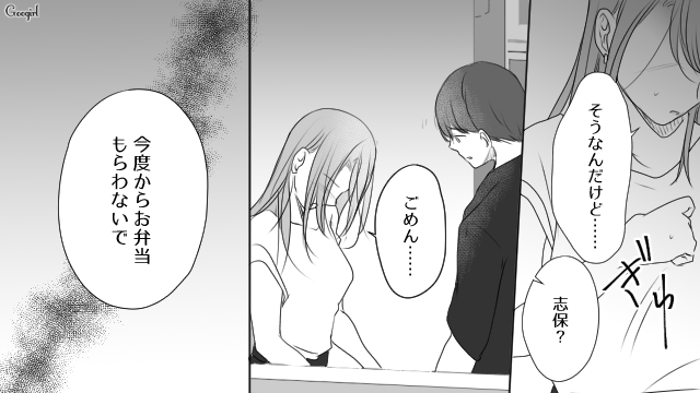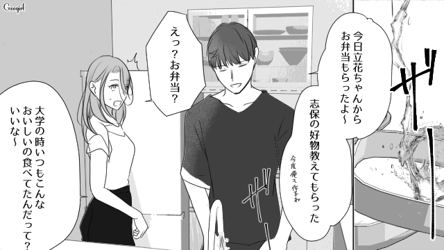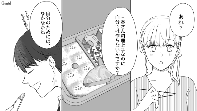 ▽ コンビニ弁当を食べている三春の健康を心配して、わざわざお弁当を手作りしてきた立花。「志保の好物を知るため」と言われ、三春はそれを笑顔で受け取ります。しかしその事実を三春から知らされた志保は、親友である立花の行動に強い不安を抱くのでした。