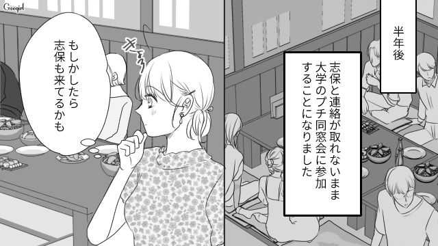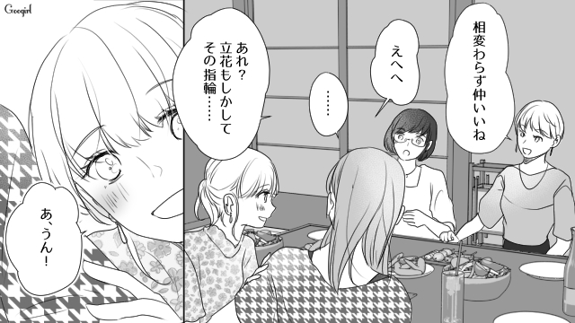 ▽ 立花は三春と同棲を始め、幸せな日々を過ごします。しかし志保とは連絡が取れず、祝福してもらえない寂しさを感じていました。半年後のプチ同窓会で志保と再会し喜ぶ立花は、志保の前で三春からもらった婚約指輪を悪気なく見せるのでした。