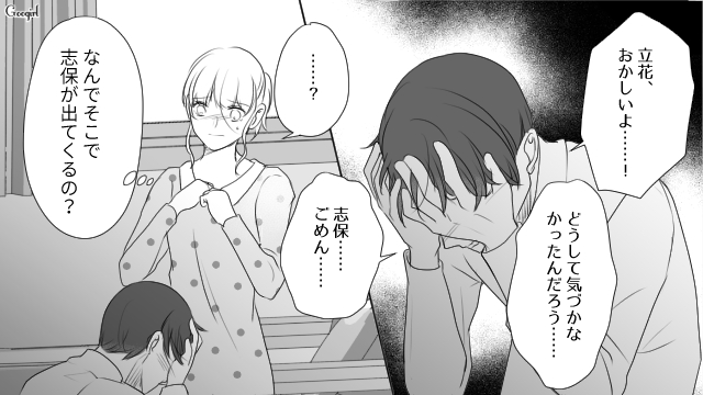 親友・志保の彼氏だった三春と結ばれた立花は、すぐに同棲を始めます。「志保に逆恨みされ、結婚式を邪魔された」と泣く立花の話を聞いて、まさか自分も同じ手口で付き合うことになったのでは……と、さすがの三春も勘繰ります。