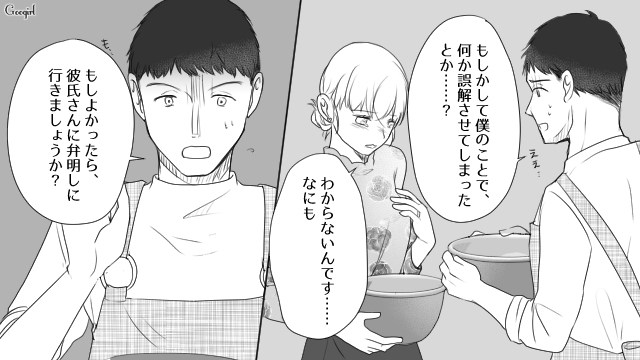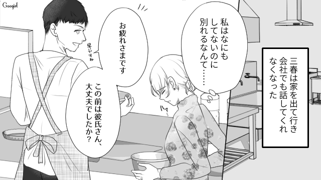 ▽ 料理教室のアシスタント・高橋との関係を疑う三春は、立花に別れを告げました。一方、三春にフラれる理由がわからない立花は、優しくしてくれた高橋に泣きつきます。けれど高橋には、立花への恋愛感情がこれっぽっちもないようですね。