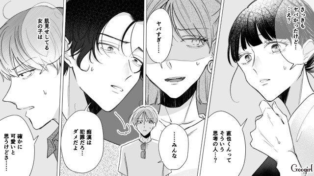大学時代の友人、浩介に誘われてBBQに参加した直也。サトルのコーデを全身真似していることを笑われ、さすがに恥ずかしさを感じます。その後、偶然同じBBQに来ていた木乃香とその友達の亜由美に遭遇! 電車で痴漢にあっていた亜由美を助けることもしなかった直也は、再び「痴漢されるような服を着ている女が悪い」と言ってしまいました。