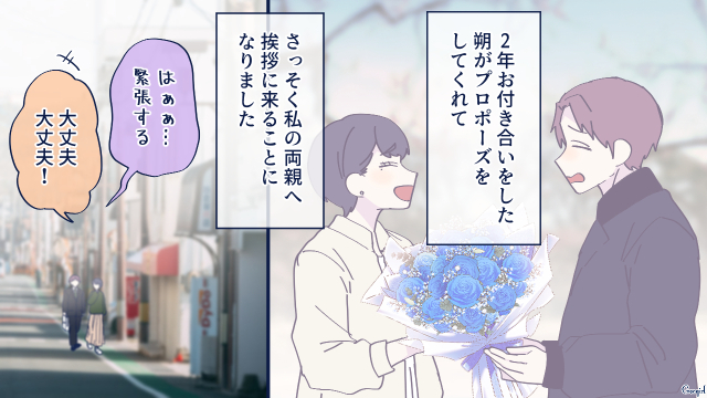 恋人の朔からプロポーズをされて、ついに里奈の両親に挨拶をする日がやってきました。朔はガチガチに緊張しているようで……。