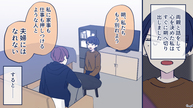 朔のダメっぷりに悩んだ里奈は、実家で両親と話をしました。改めて、両親のような夫婦が理想だと感じた里奈は、朔に別れを切り出しますが……。