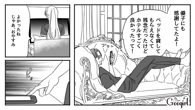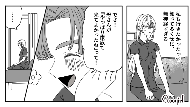 ▽ 優子が楽しみにしていたアトラクションを、自分抜きで義家族と楽しんだ亮介。無神経にも電話でキャーキャー感想を伝えてくる様子に、優子はうんざりしていました。翌日帰宅した亮介も、まだテーマパークの余韻が残っているようで……。