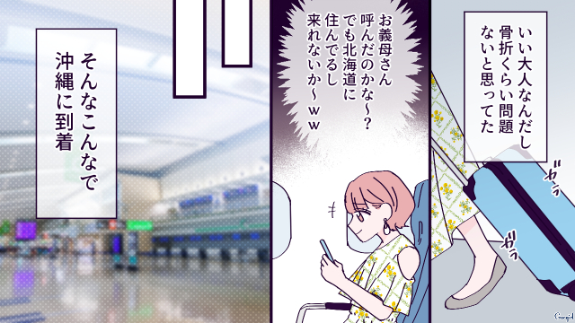 今回は骨折した夫を見捨て、「お義母さんに来てもらったら?」と沖縄に行った結果のエピソード第2話をご紹介します!