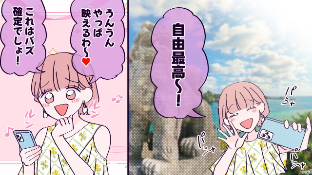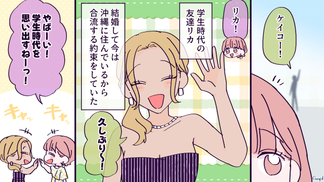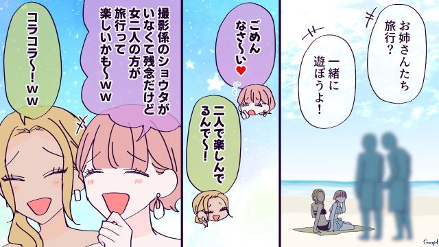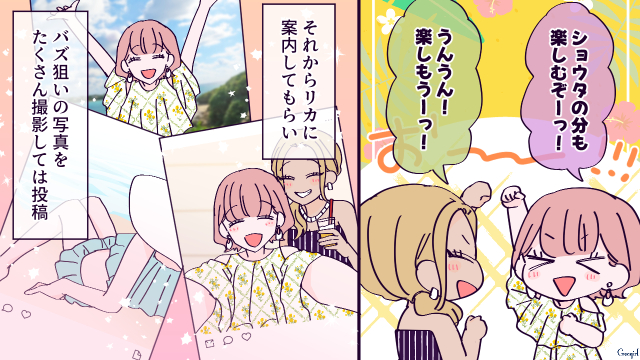 ▽ 置いて行かれて寂しそうなショウタが可哀想ですね……。沖縄をめいっぱい満喫しているケイコはすっかりショウタのことなんて忘れているようです……。