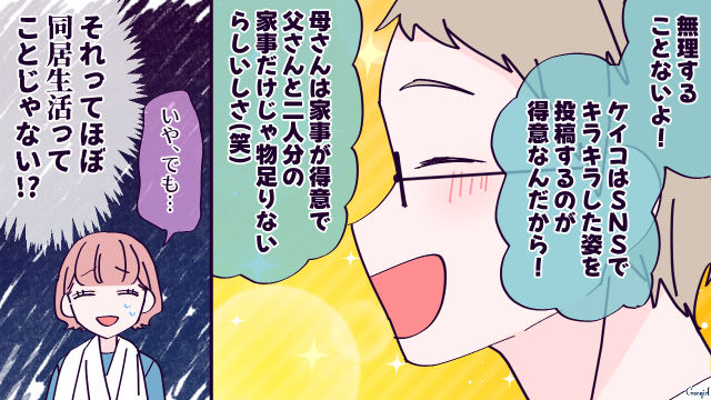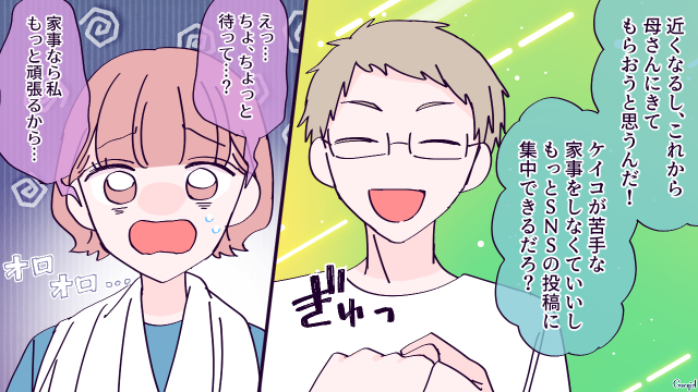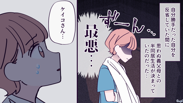 ▽ ケイコが実家にいる間に、とんでもないことが決まっていたようですね(笑)。家事をやってくれるとしても、義母と半同居は気を使うしストレスが半端ないでしょうね! でも、ケイコにはちょうどいいお灸なのではないでしょうか(笑)。