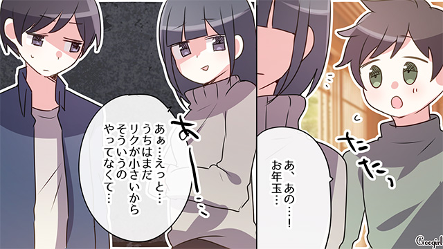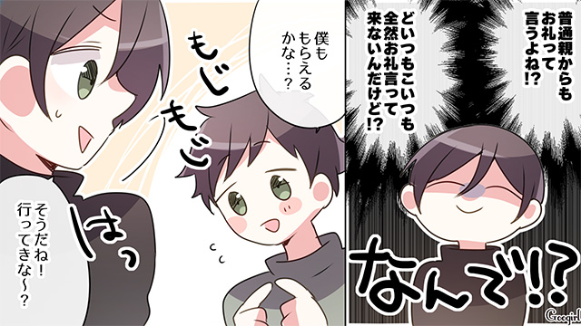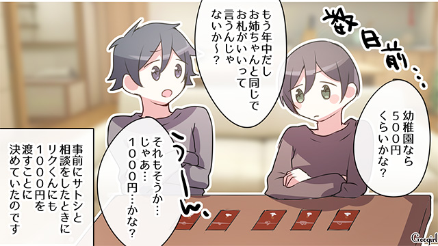 ▽ ユキコ側は年齢差などいろいろと考慮して金額を決め、幼稚園児のリクにも1,000円を渡しているのに、コウタには0円というのは信じられないし、可哀想ですよね……。お年玉制度をやらないのであれば、もらうこともしてはいけませんよね!