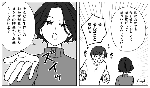 ▽ 「潔癖症だから手作りおかずを作って」とのたまわっていたヨシキ。しかし、実際は潔癖症などではなく、ただシオリにおかずを手作りさせたかっただけのようです。シオリに完全に論破されたヨシキ。自分がいかに理不尽なことを言っているか、わかってくれたのでしょうか?