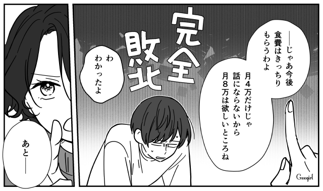 ▽ ヨシキは、自身の発言の無茶苦茶さをようやく理解したようですね。食費8万の枠を勝ち取ったシオリ。さらにヨシキに何か要求するようですが――?