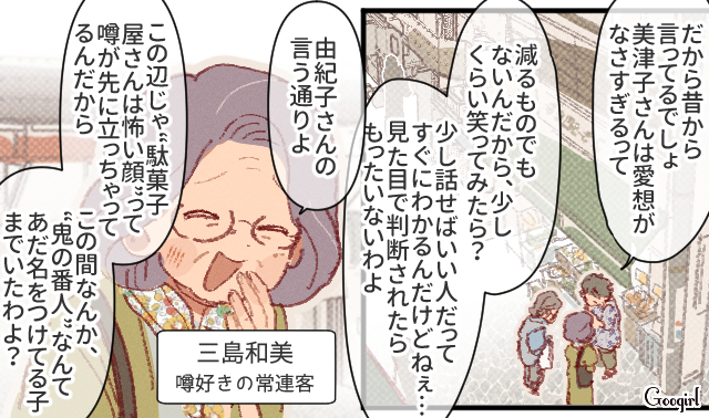 ▽ 駄菓子屋のおばあさんのことを昔から知っている慎太郎の祖母・美津子は、おばあさんの素っ気なさをもったいないと感じているようです。