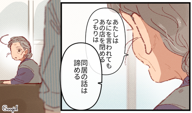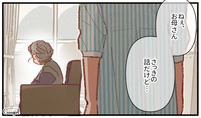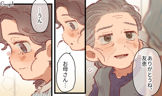 ▽ おばあさんと彰斗のやり取りを見て、おばあさんとの同居を諦めた友恵。しかしそれはネガティブなものではありません。母親には幸せでいて欲しい。友恵のその願いは、決して変わりません。