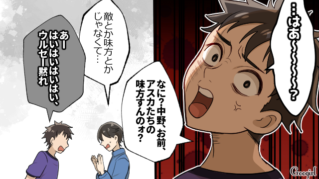 ▽ アスカをかばったせいで、イジメの標的にされてしまった中野。真っ当なことを言っているのに、ゴリ押しと数の力でねじ伏せる迫田。最低です。
