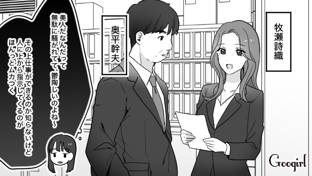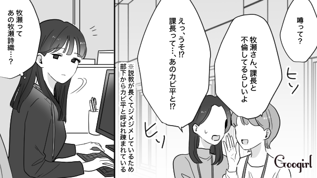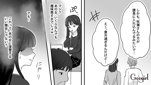 ▽ 気に入らない同僚、牧瀬詩織の不倫の噂を耳にする花音。彼女を貶めるべく、花音はとある方法を思いつきます。