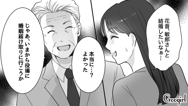 ▽ 敏郎に詐欺を疑われ、警察に連れていかれそうになる花音。結婚か警察か。究極の選択を迫られ、花音は敏郎との結婚を受け入れます。