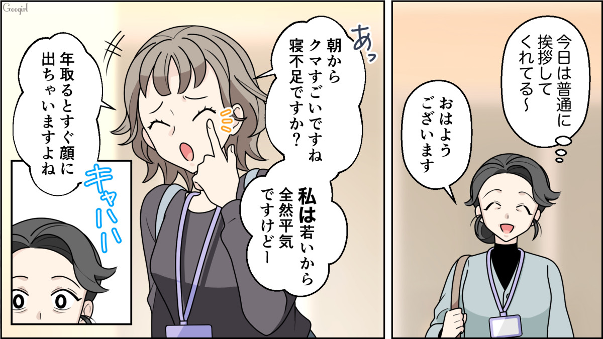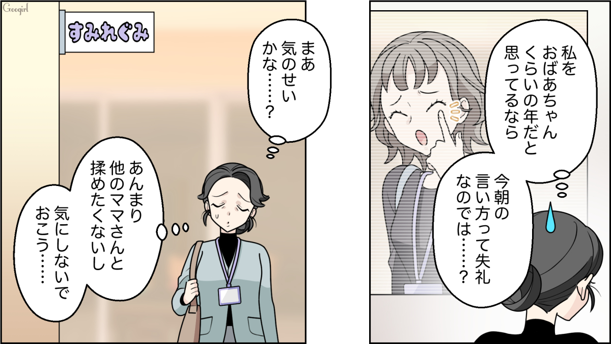▽ 翌日井上から挨拶してもらい、クマを褒められご機嫌なサナエ。ところがお迎えの時に他の40代ママさんに若さマウントをする井上に遭遇! 自分が褒められていたわけではなく、高齢ママと決めつけられて、マウントをとられていたことにようやく気付きます。