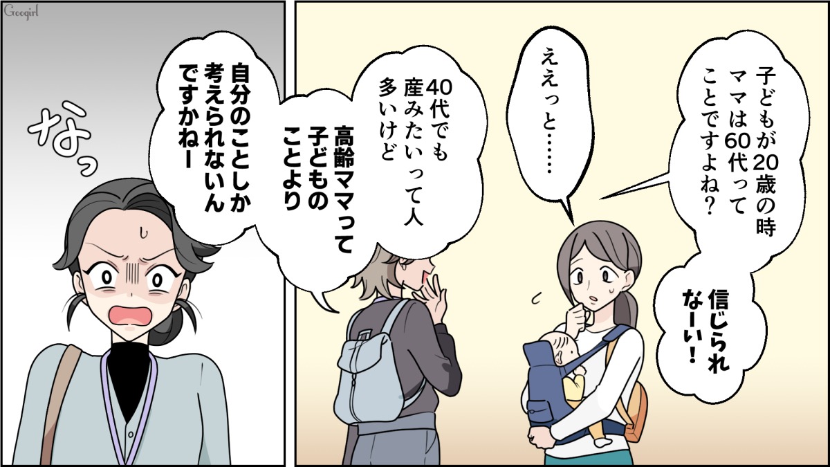 今回は、「『高齢ママ』と決めつけてマウント? 無礼なママ友を一瞬で黙らせた『最強の正体』」第4話をお届けします。