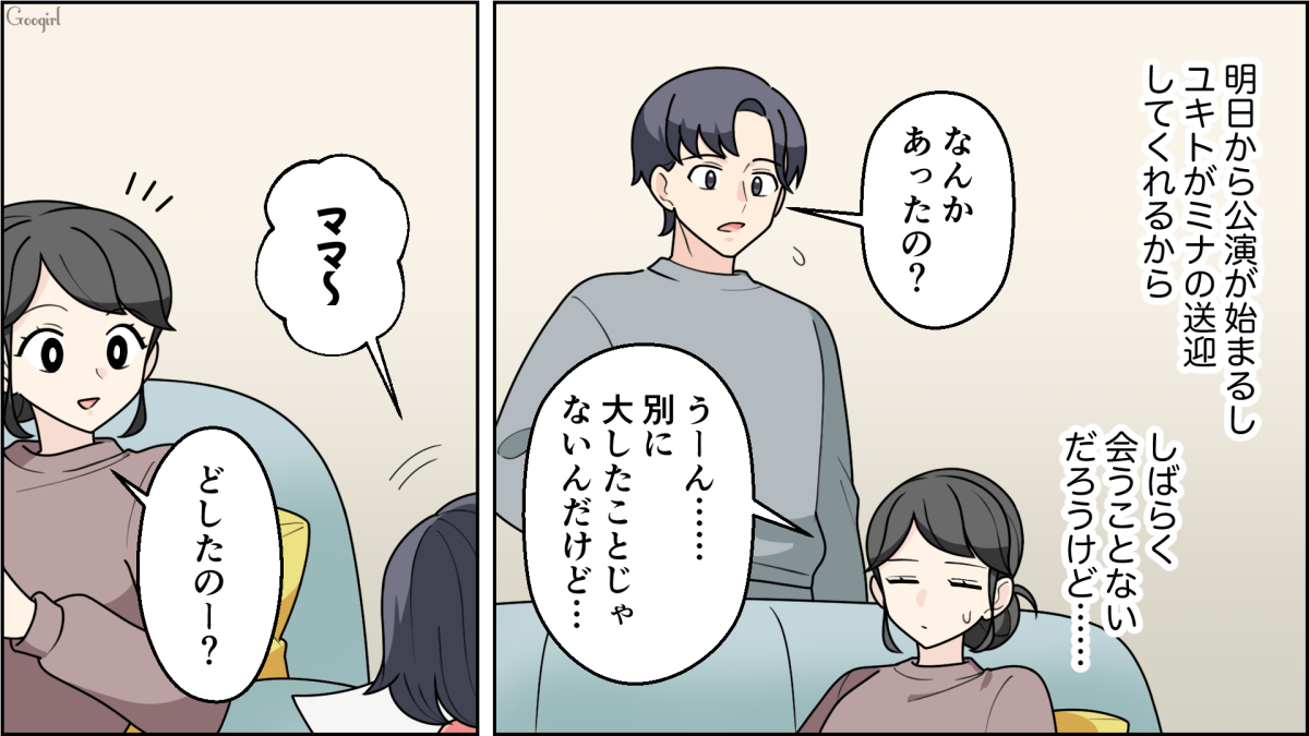 ▽ 失礼な井上をしっかり注意したものの、それからマウントをあからさまに取られる様になりました。とうとう公演が始まり、しばらくは夫と送迎が交代するので、しばらく会わないで済むと安心します。お遊戯会の招待状に書かれていたのは、一体何の日付なのでしょうか?