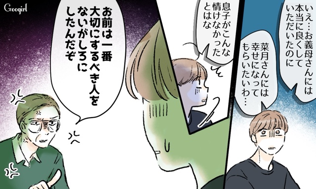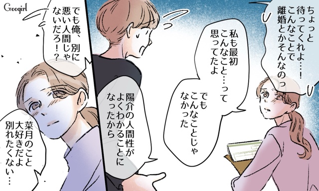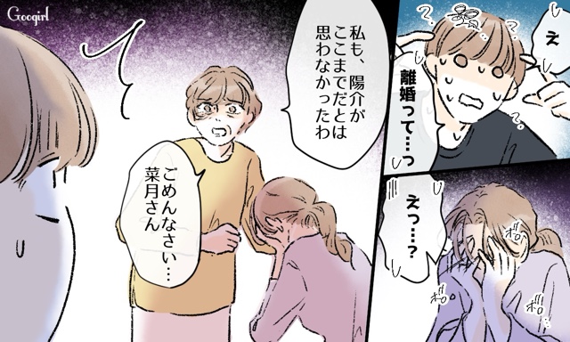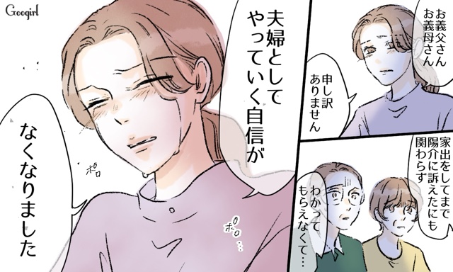 家出先の義実家へ菜月を迎えに来た陽介。和解できるかもしれないと思った菜月の思いは、すぐに打ち砕かれました。キレた菜月は……。