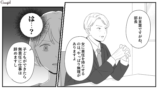 さて今回は「『女は家を守れ』と昇進を妨害する上司に正論パンチ!」第4話をお届けします!