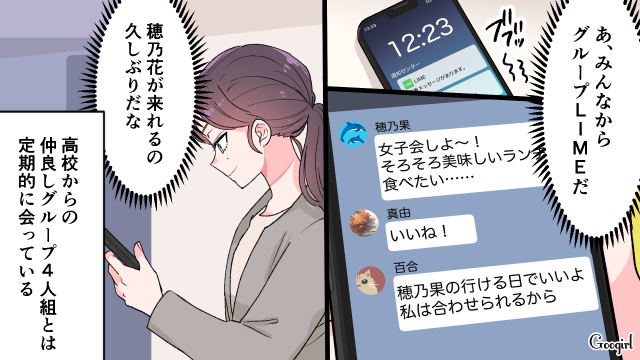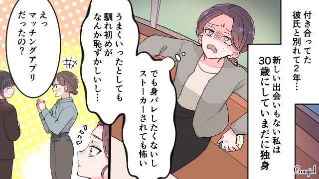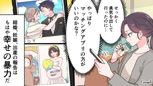 ▽ マッチングアプリに興味はあるものの、いろんな言い訳ばかりで一歩を踏み出せない未亜。 そんなある日、高校時代からの仲良し4人組、穂乃花・真由・百合との女子会が開かれます。自分より先に結婚しないと思っていた百合の口から飛び出したのは、まさかの結婚報告でした。