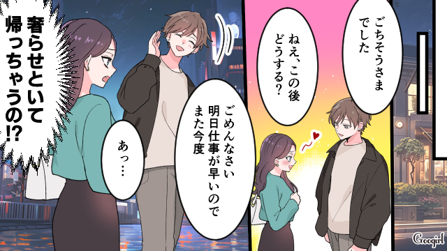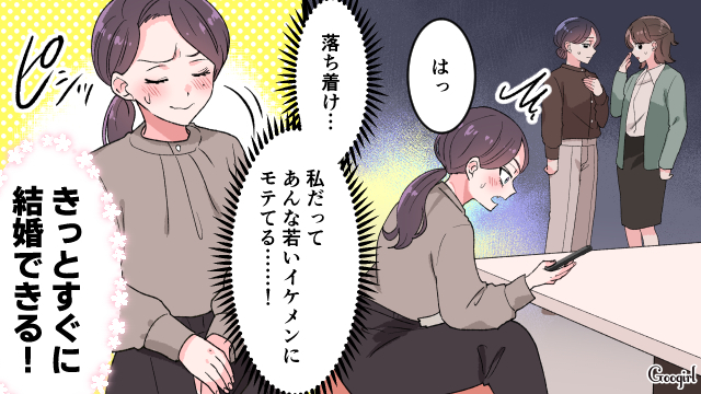 30歳の未亜は「結婚すれば幸せになれる」と信じて婚活中。仲良しの百合がマッチングアプリで同僚と再会し、スピード婚を果たしたことに背中を押され、自分もアプリを始めます。穂乃花と真由へ行き過ぎた発言への忠告を、ただの結婚マウントだと受け取った未亜は、再びマッチングアプリでの婚活に励みます。希望条件よりも100万年収の低い25歳のイケメンとデートを楽しみますが、レジで「ごちそうさまでした」と笑顔で言われてしまい……!