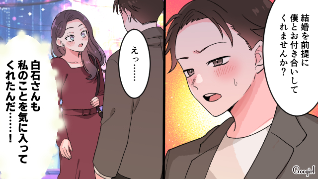 30歳の未亜は「結婚すれば幸せになれる」と信じて婚活中。仲良しの百合がマッチングアプリで同僚と再会し、スピード婚を果たしたことに背中を押され、自分もアプリを始めます。心の中で未来の旦那様と呼んでいた25歳のイケメンから、速攻ブロックされてしまった未亜。悔しさをバネにいろんな男性とマッチングしますが、微妙な男性ばかりが続きます。ダメもとでマッチングした条件をクリアする男性は、ようやく会えた「普通の人」で……?