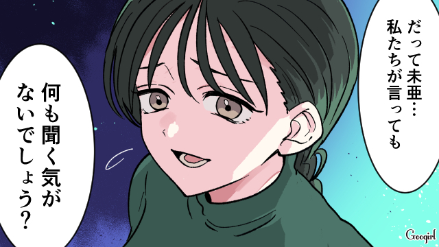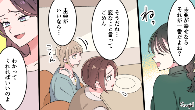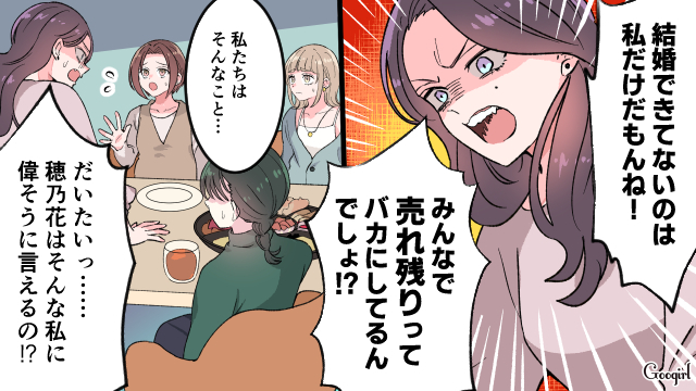 「結婚すれば幸せになれる」と信じる未亜はマッチングアプリをはじめ、ようやく出会えた未亜の条件をクリアする普通の人、白石からプロポーズされました。穂乃花の第二子出産パーティで、笑顔で婚約を報告します。最初はお祝いしてくれた穂乃花たちですが、聞けば聞くほど未亜の結婚相手、白石に不信感が募るばかり。未亜のことを思って考え直した方がいいと忠告しますが、未亜はまるで聞く気がなくて、上から目線だと怒り始めます。