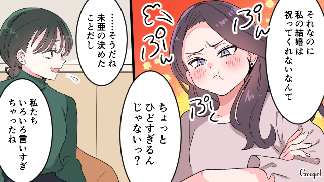 ▽ 誰にもお祝いされず、嫌味ばかりを言われた未亜は、ついに逆ギレして穂乃花の「でき婚」を持ち出し、無計画な結婚だと悪口を重ねます。とうとう百合から、「未亜がそれでいいなら、もう何も言わない」と見放すように言われてしまいました。