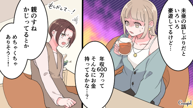 「結婚すれば幸せになれる」と信じる未亜はマッチングアプリをはじめます。ようやく出会えた白石からプロポーズされたことを仲良しグループの穂乃花たちに報告するものの、なぜかお祝いしてくれません。ついに逆ギレした未亜は穂乃花の「でき婚」を持ち出し、無計画な結婚だと悪口を重ねます。とうとう百合から、「未亜がそれでいいなら、もう何も言わない」と見放すように言われてしまって……。